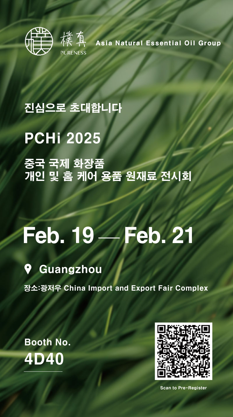 퓨어니스는 200종 이상의 싱글 에센셜 오일, 다양한 기초 개리어 오일, 하이드로솔 등 원료와 OEM 제품을 함께 전시할 예정입니다. 저희는 4D40 부스에서 귀하의 방문을 기다리고 있습니다.
