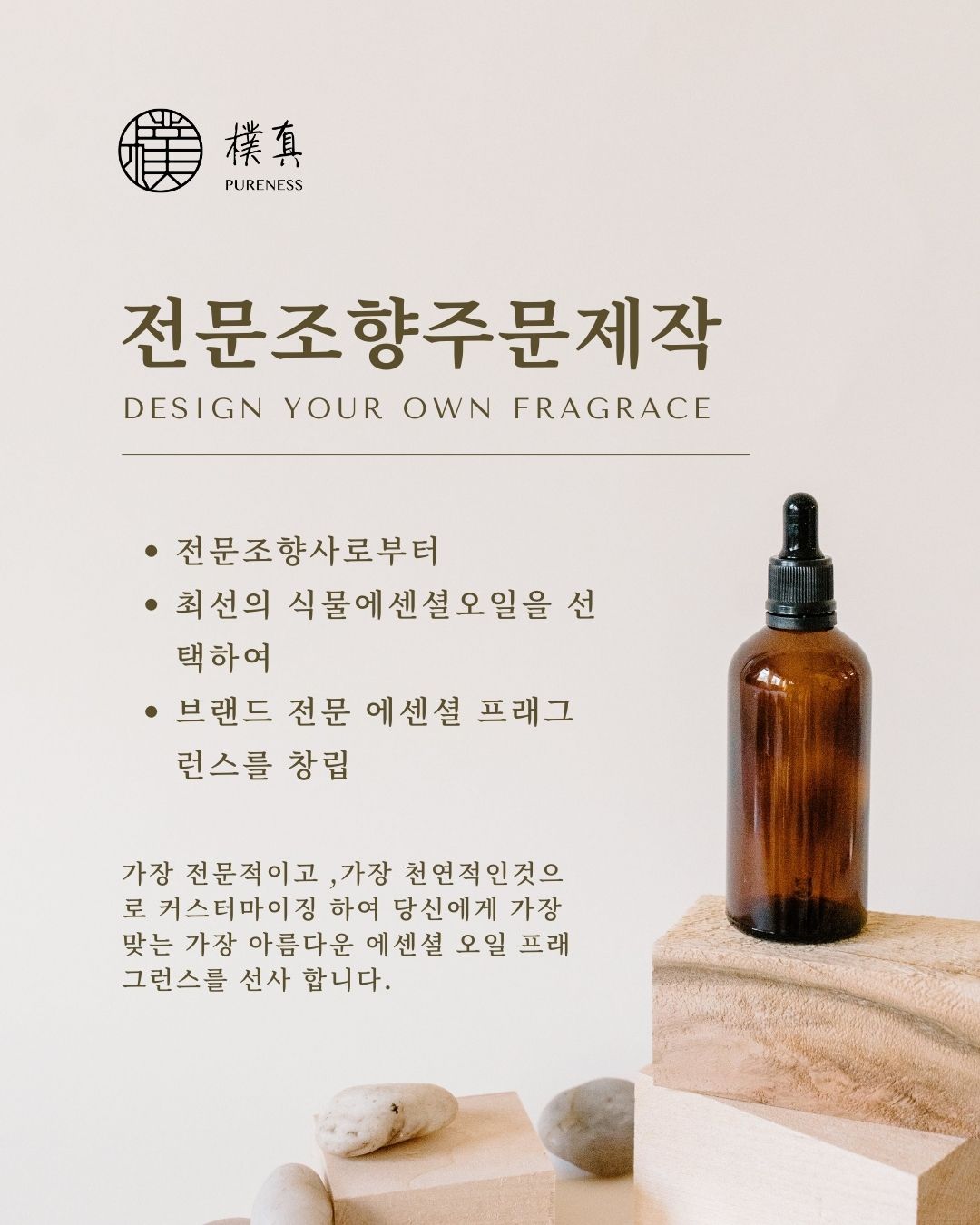 퓨어니스는 20년 이상 에센셜 오일 산업에 깊이 관여하여 포괄적인 포뮬러 요구사항과 모든 범위의 케어제품 위탁생산방안을 제공하고 있습니다. 고객 제품요구 사항을 기반으로 포뮬러를 구성하고 맞춤형 향, 및 효능을 만들어 드립니다. 또한 위탁생산을 통해 독점 브랜드 향이 있는 스타 제품을 제조합니다.저희와의 상담을 환영합니다!!