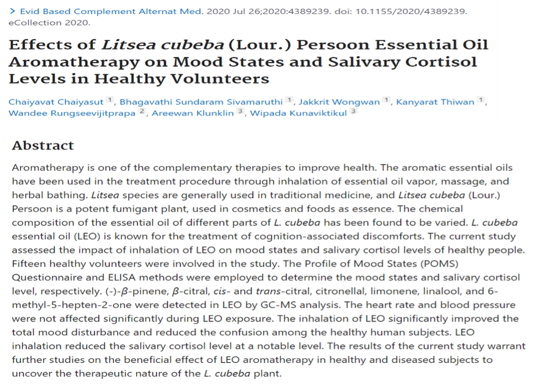 - Chaiyasut C, et al. Effects of Litsea cubeba (Lour.) Persoon Essential Oil Aromatherapy on Mood States and Salivary Cortisol Levels in Healthy Volunteers. Evid Based Complement Alternat Med. 2020. Jul 2632020:9.