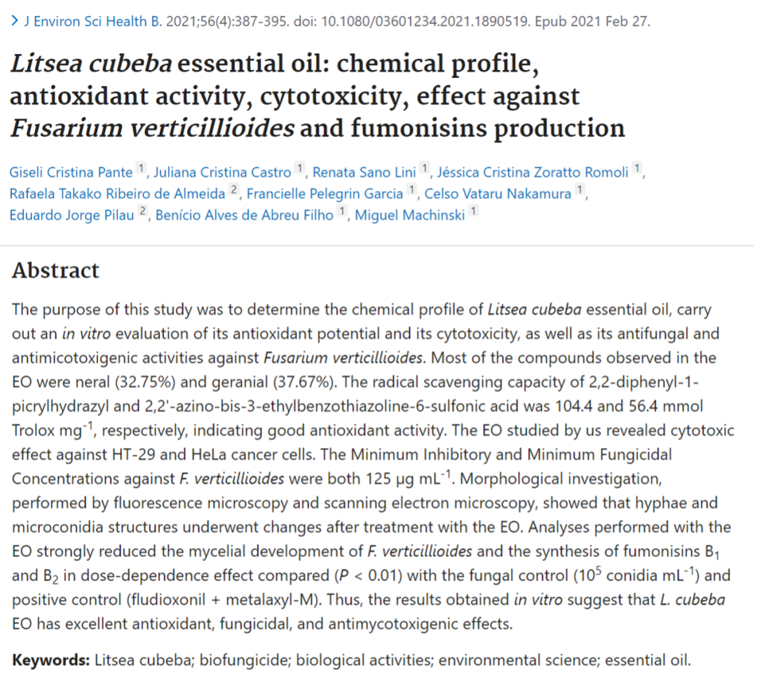 - Pante GC, et al. Litsea cubeba essential oil: chemical profile, antioxidant activity, cytotoxicity, effect against Fusarium verticillioides and fumonisins production. J Environ Sci Health B. 2021;