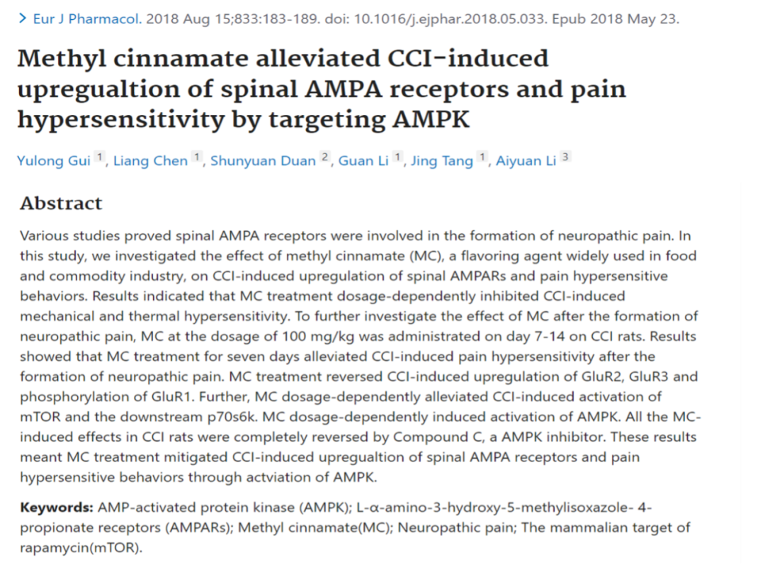 - Gui Y, et al. Methyl cinnamate alleviated CCI-induced upregualtion of spinal AMPA receptors and pain hypersensitivity by targeting AMPK. Eur J Pharmacol. 2018. Aug 15;833:183-189.