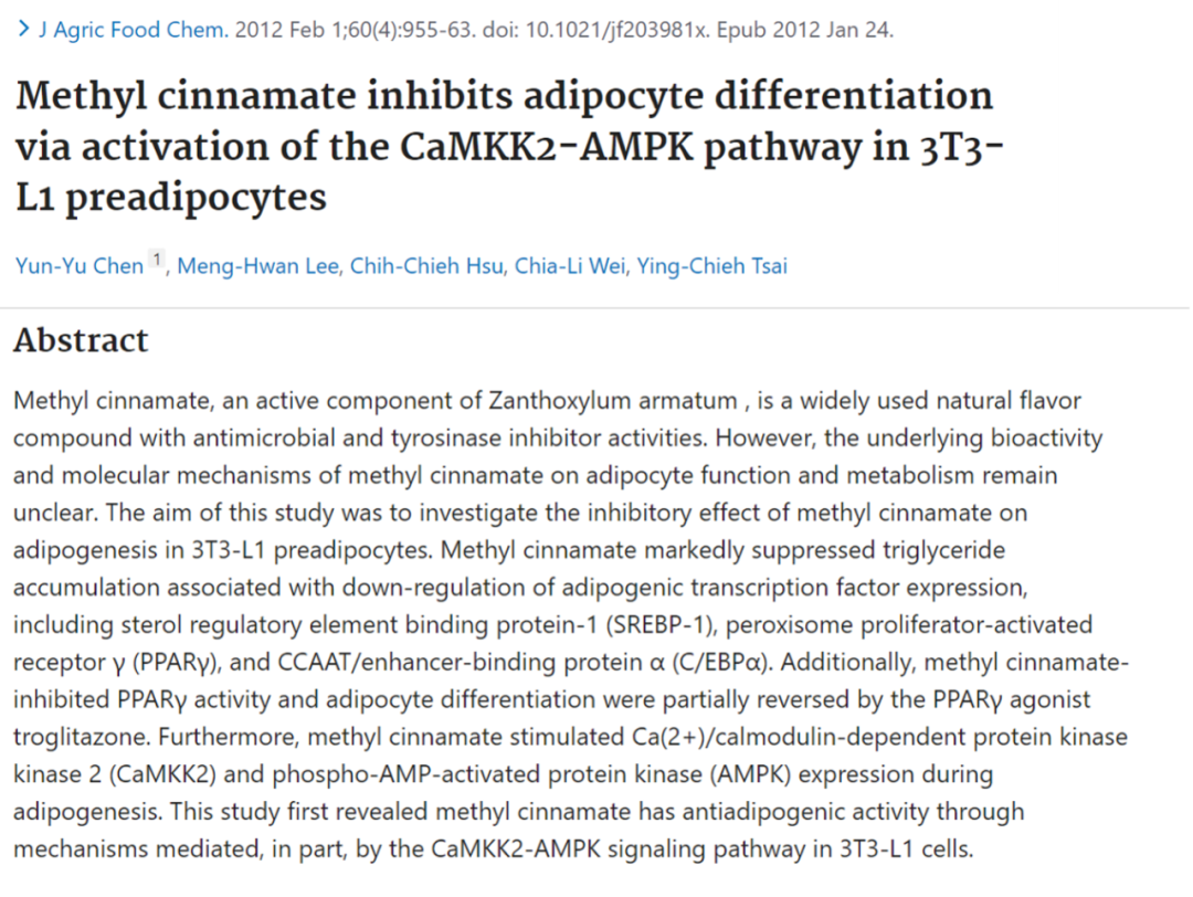 - Chen YY, et al. Methyl cinnamate inhibits adipocyte differentiation via activation of the CaMKK2-AMPK pathway in 3T3-L1 preadipocytes. J Agric Food Chem. 2012. Feb 1;60(4):955-63.