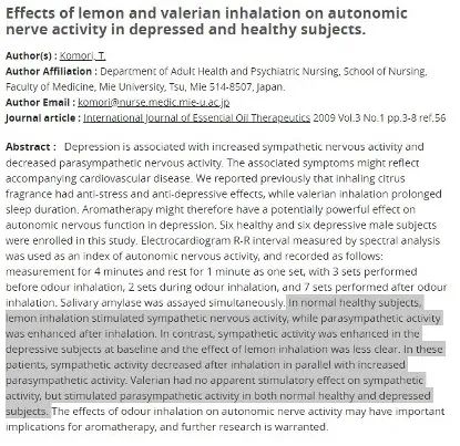 1. 吸入檸檬和纈草對憂鬱和健康受試者的自主神經活動的影響。國際精油治療期刊 2009 年第 3 卷第 1 期第 3-8 頁 ref.56