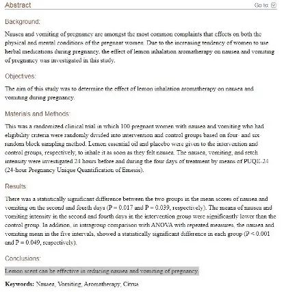 ▸ Yavari Kia P 등의 연구에서, 임신 중 레몬 아로마 오일의 흡입이 식욕과 임신반응에 미치는 영향에 대한 실험.