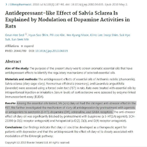 ▸ Seol 등은 2010년에 동물실험으로 몇가지 에센셜 오일의 항우울효과를 검토한결과 측정된 모든 에센셜 오일중 클라리세이지(5%)가 스트레스해소에 가장 효과가 있는것으로 밝혀졌는데 그 원인은 클라리세이지가 로토닌, 도파민, 아드레날린, GABA 수용기를 조절할수 있기때문일수 있다고 나타났습니다.