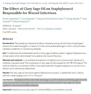 2. Monika Sienkiewicz et al.The Effect of Clary Sage Oil on Staphylococci Responsible for Wound Infections. Postepy Dermatol Alergol.2015 Feb;32(1):21-6.