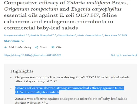 - Maryam Azizkhani et al. Comparative efficacy of Zataria multiflora Boiss., Origanum compactum and Eugenia caryophyllus essential oils against E. coli O157:H7, feline calicivirus and endogenous microbiota in commercial baby-leaf salads. International Journal of Food Microbiology, Volume 166, Issue 2 September 2013, Pages 249-255.