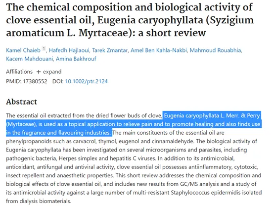 - Chaieb K, Hajlaoui H, Zmantar T, Kahla-Nakbi AB, Rouabhia M, Mahdouani K, Bakhrouf A. The chemical composition and biological activity of clove essential oil, Eugenia caryophyllata (Syzigium aromaticum L. Myrtaceae): a short review. Phytother Res. 2007 Jun;21(6):501-6.