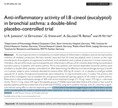 - U R Juergens , U Dethlefsen, G Steinkamp, A Gillissen, R Repges, H Vetter. Anti-inflammatory activity of 1.8-cineol (eucalyptol) in bronchial asthma: a double-blind placebo-controlled trial. Respir Med. 2003 Mar;97(3):250-6.